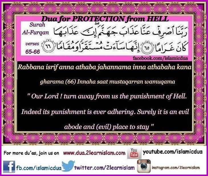 “Our Lord, avert from us the punishment of Hell. Indeed, its punishment is ever adhering; Indeed, it is an evil abode and resting place.”