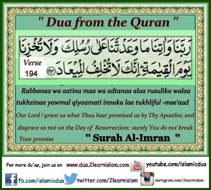 “Our Lord, and grant us what You promised us through Your messengers and do not disgrace us on the Day of Resurrection. Indeed, You never break (Your) Promise.”