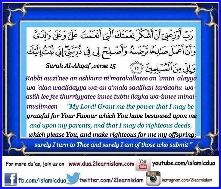 رَبِّ أَوْزِعْنِىٓ أَنْ أَشْكُرَ نِعْمَتَكَ الَّتِي أَنْعَمْتَ عَلَيَّ وَعَلَىٰ وَالِدَيَّ وَأَنْ أَعْمَلَ صَـٰلِحًا تَرْضَىٰهُ وَأَصْلِحْ لِي فِي ذُرِّيَّتِي ۖ إِنِّي تُبْتُ إِلَيْكَ وَإِنِّي مِنَ الْمُسْلِمِينَ