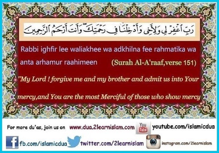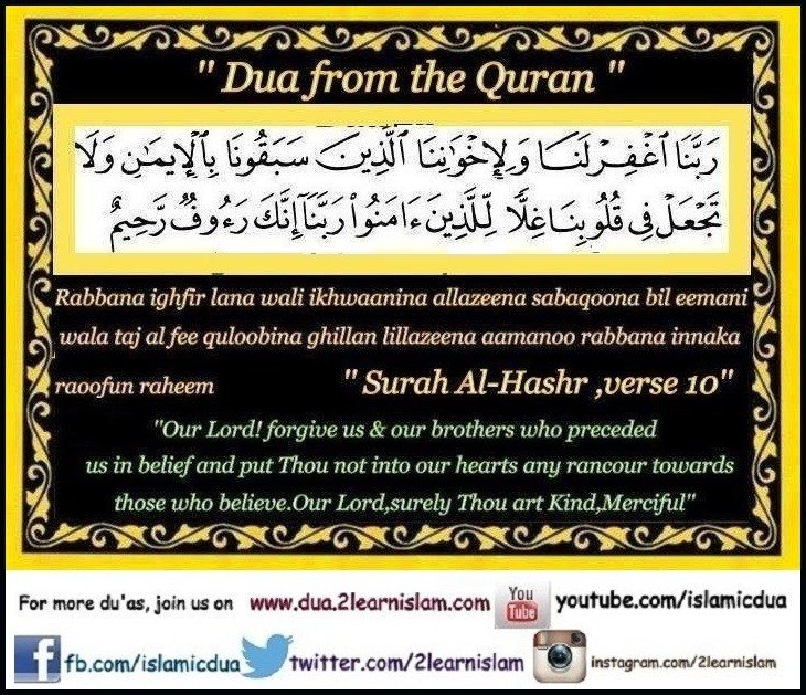 رَبَّنَا اغْفِرْ لَنَا وَلِإِخْوَانِنَا الَّذِينَ سَبَقُونَا بِالْإِيمَانِ وَلَا تَجْعَلْ فِي قُلُوبِنَا غِلًّا لِّلَّذِينَ آمَنُوا رَبَّنَا إِنَّكَ رَءُوفٌ رَّحِيمٌ