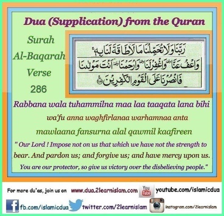Our Lord, and lay not on us a burden greater than we have the strength to bear. And pardon us; and forgive us; and have mercy upon us. You are our protector, so Help us against the disbelieving people.”