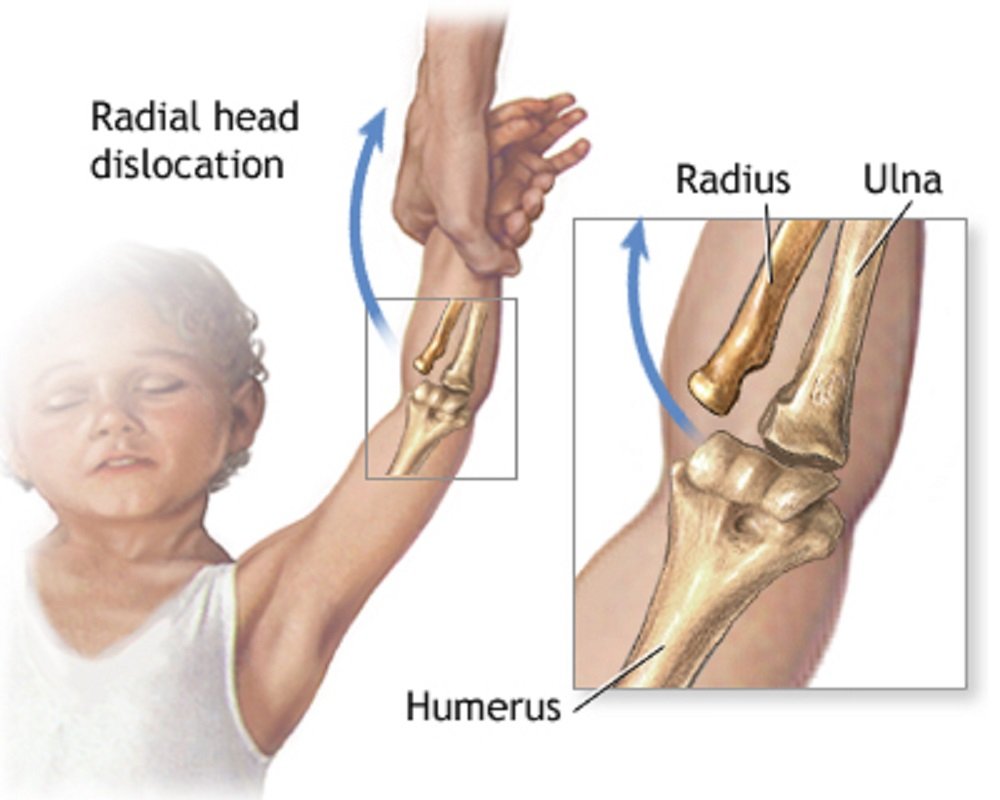 A pulled or nursemaid’s elbow (Radial head subluxation) usually occurs in young children. It happens when a young child is pulled or lifted by the hand or wrist while his or her arm is held straight. For example, the bone can pull out of position, or sublux, when you try to lift a child up  by the hand, pull a resistant child’s hand to get him or her to move faster, or hold onto a child’s hands and swing him or her around while playing.