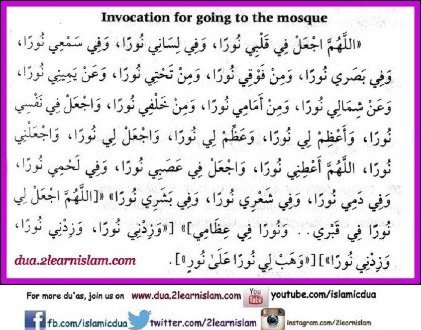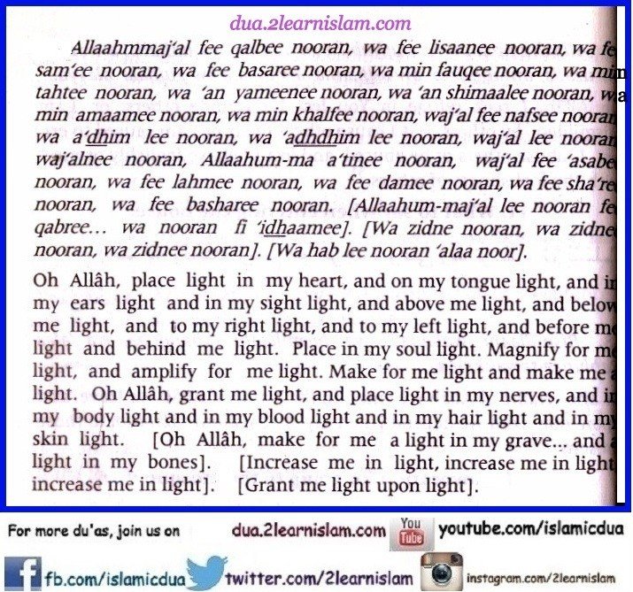Allaahummaj’al fee qalbee noora, wa fee lisaaanee noora, wa fee sam’ee noora, wa fee basaree noora, wa min fawqee noora, wa min tahtee noora, wa ‘an yameenee noora, wa ‘an shimaalee noora, wa min ‘amaamee noora, wa min khalfee noora, waj’alfee nafsee noora, wa ‘a’dhim lee noora, wa ‘adhdhim lee noora, waj’al lee noora, waj’alnee noora