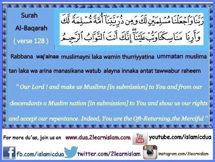 “ Our Lord, and Make us Muslims [in submission] to You and from our offspring a Muslim nation [in submission] to You. And show us our ways of worship (all the ceremonies of pilgrimage – Hajj and ‘Umrah, etc.)and turn to us (in Mercy); Indeed, You are the One Who accepts repentance, the Most Merciful.”